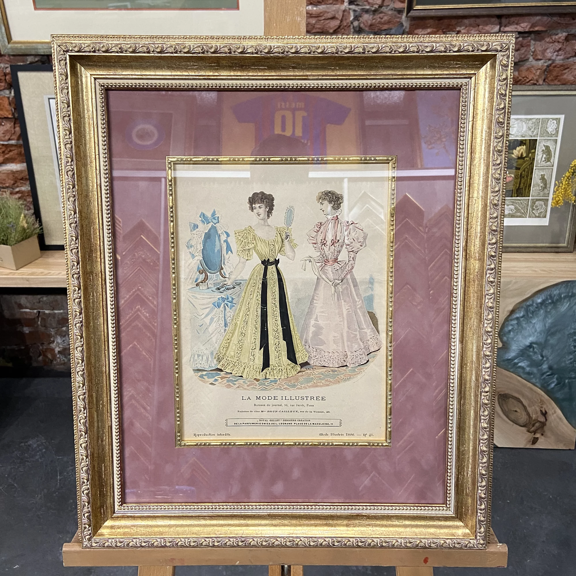 Оригинальный лист-приложение к популярному периодическому изданию о моде. Журнал «La Mode illustree» (Иллюстрированная мода). Гравюра представляет женские модели повседневного платья конца XIX века. Некричащие оттенки и ажурные детали гравюры создают настроение дамского будуара. Прелестные модницы умиляются перед зеркалом. Детали одежды подробно показаны для представления актуальных тенденций моды. Силуэты и линии предельно ясны и интересны.