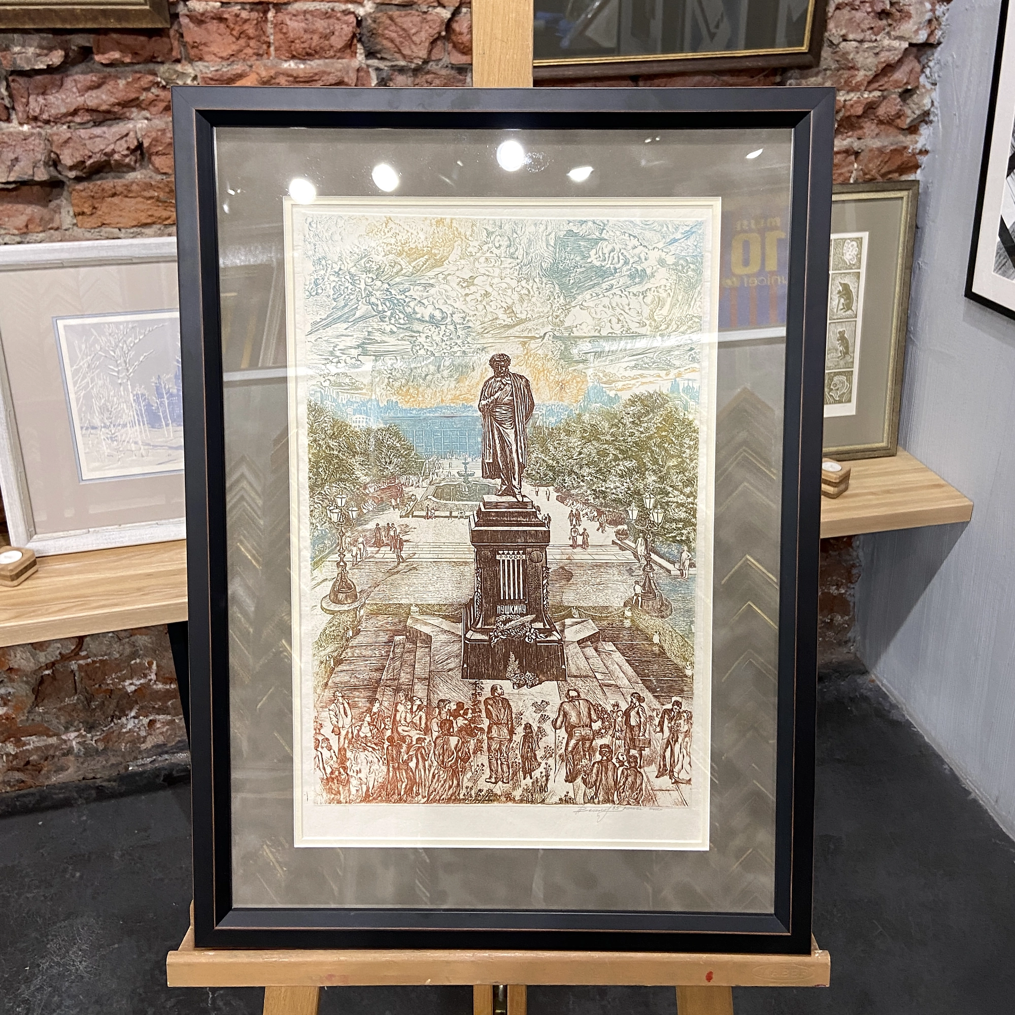 Оригинальная цветная работа, выполненная в технике офорт в 1985 году художником А. И. Веселовым. В центре внимания памятник А. С. Пушкину, возле которого много горожан и гостей столицы. Художник выделяет цветом монумент на фоне пастельного неба. Задний план не проработан архитектурой, а создан более природным, чем на натуре. Дивными облаками автор окутывает сюжет. Не кричащие натуральные оттенки зелени в сквере придают работе живого настроения. Работа подписана художником внизу справа. Техника офорта представляет собой оттиск с металлической платины покрытой кислотоупорным лаком. Выполняются штрихи разной глубины, протяженности и направления. Затем следует травление пластины и перенос краски. При многоцветной печати разные цвета наносятся на разные пластины или аккуратно на одну основу специальным тампоном, либо с помощью тонкой кисточки.