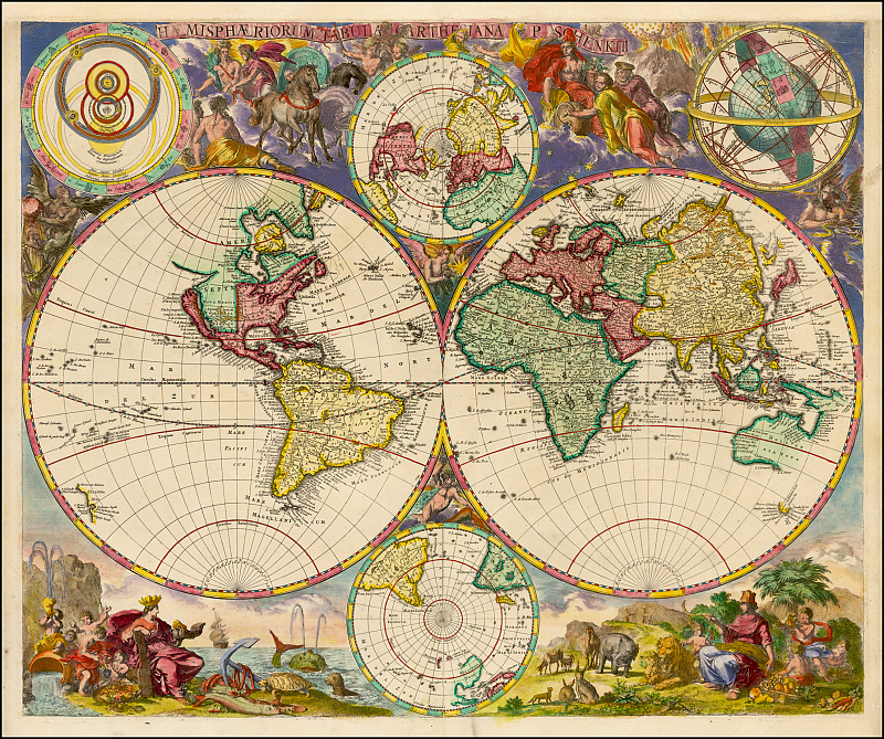 Карта мира Питера Шенка II, также известная как "Карта мира, или глобус, в двух гемисферах", была создана в 1703 году и была одним из наиболее впечатляющих и технических достижений картографии XVIII века.
