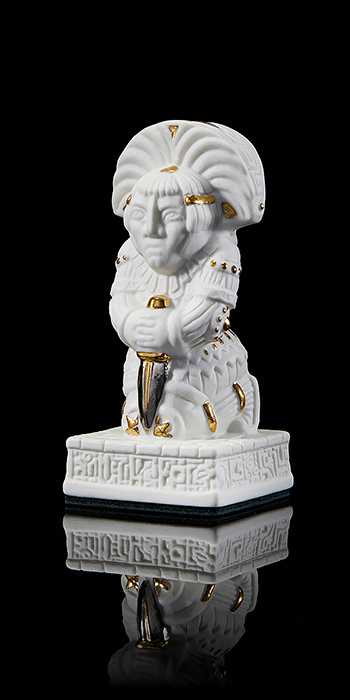 Фигуры из бисквитного фарфора, покрытые золотом и платиной, напоминают жрецов, воинов и хранителей священных храмов. Белый цвет олицетворяет ясность, свет и божественный порядок. Глубокий бирюзовый — символ богатства, вечности и энергии жизни.